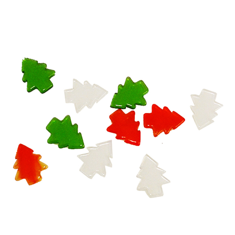 One pack of Xmas tree shapes gives you 10 pieces approx in assorted colours of Clear, Red & Green.Â