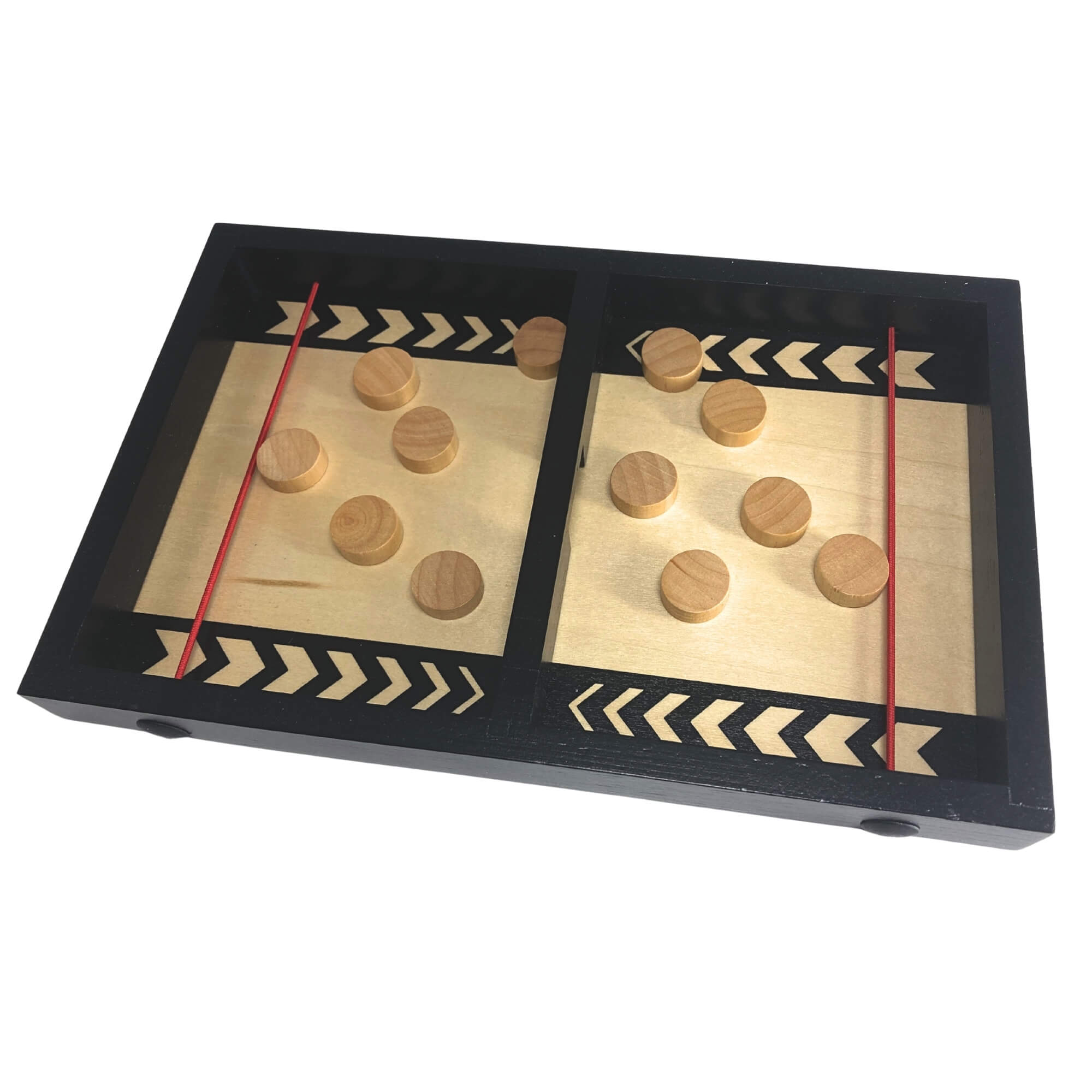 Bring fast-paced excitement to any tabletop with this Wooden Puck-Slinger Game! Designed for two players, each gets an equal set of wooden pucks and races to sling them through the center arch using the elastic launcher. The first to clear their side wins – but stay sharp: stray pucks must be retrieved, and you can only handle your own pieces. It’s a beautifully crafted, high-energy classic that blends skill, speed and friendly competition.